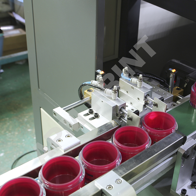 All shapes of glass bottles, cups, mugs. It can stamp any shape of containers all around in 1 print.